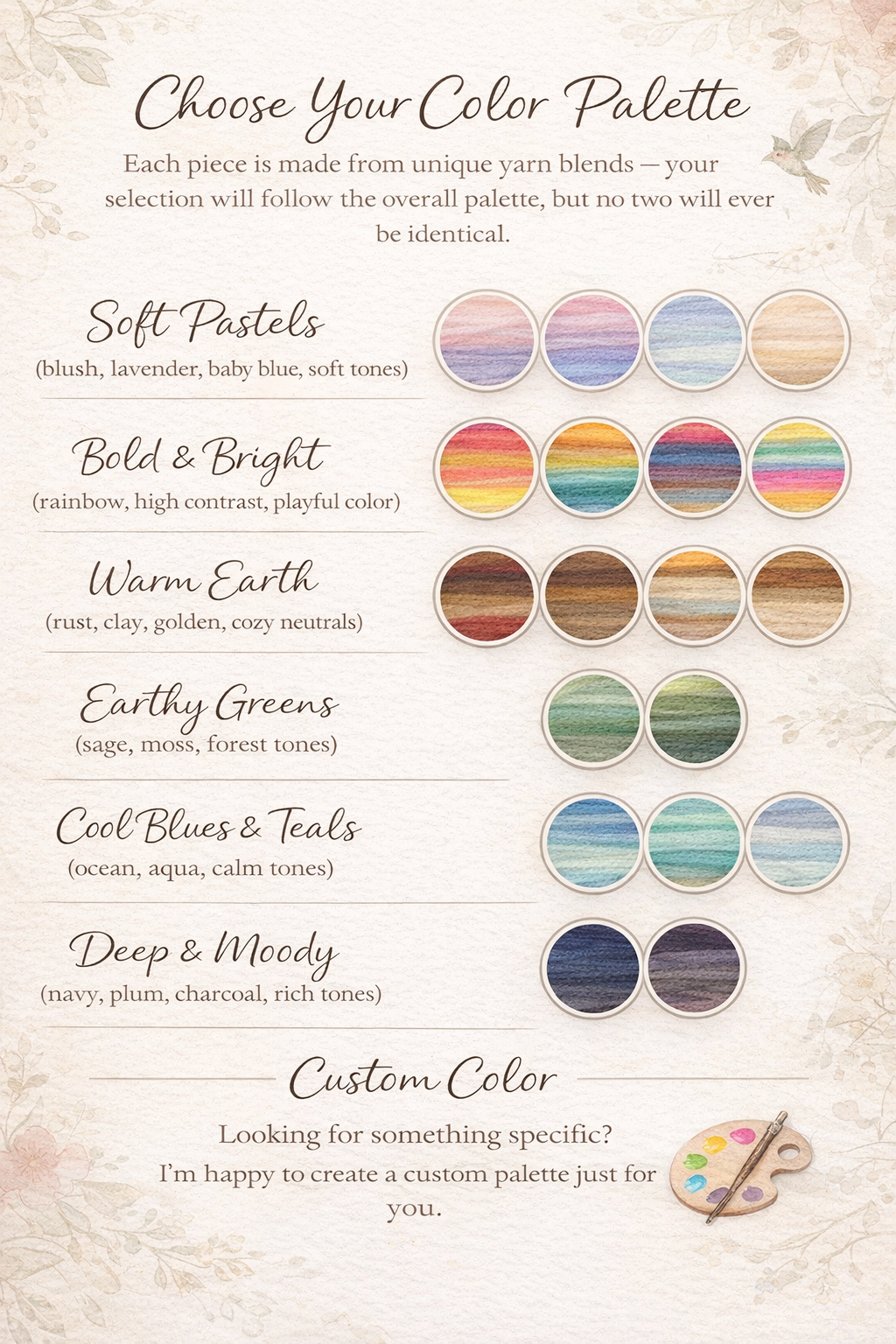 Everything at Harts & Crafts Shoppe is made in small batches with durable stitching, gentle textures, and a warm vintage-boho aesthetic. Because each piece is handmade, slight variations make every item one-of-a-kind.